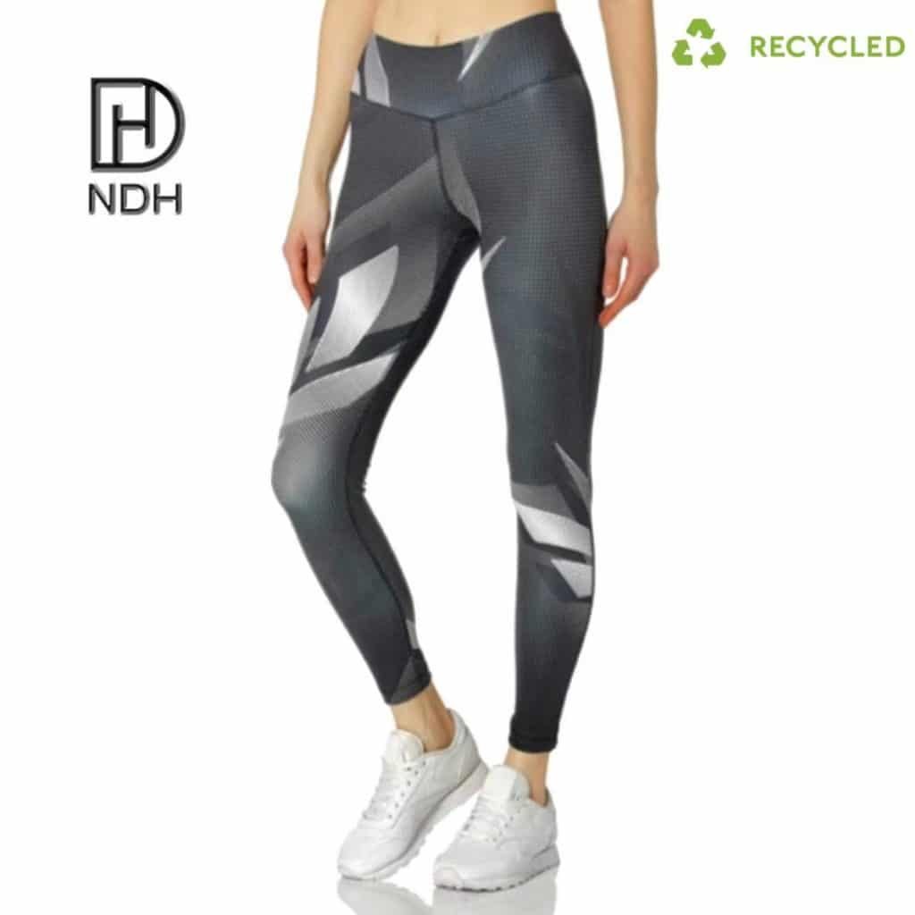 The interlock seams tummy control sublimated leggings are made with recycled spandex nylon which has details like mesh panels and flattering stitching.